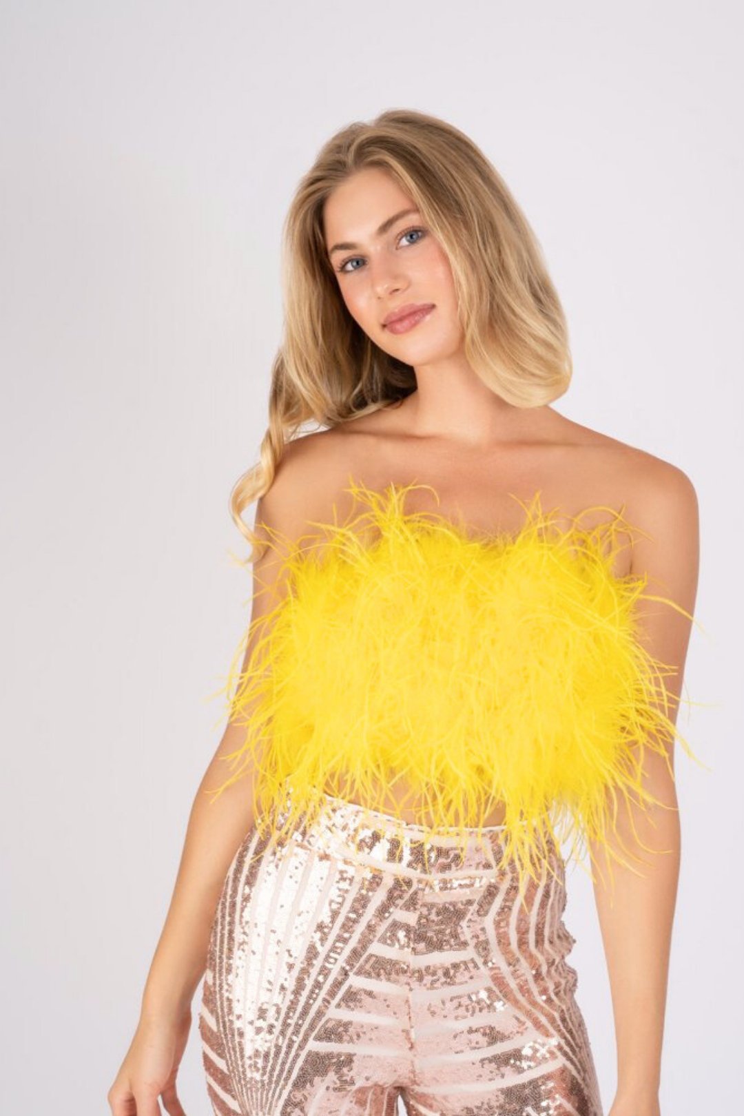 Introducing the Daisy Ostrich Feather Top in 6 colors: Fuscia Fever, Baby Pink, Electric Yellow, Goddess Green, Royal Blue, and Baby Blue. Inspired by the free-spirited soul within us all, this top is the perfect companion for festival season or a night out on the town. Its captivating design effortlessly elevates any outfit, turning heads and sparking conversations wherever you go. Each feather is thoughtfully handpicked and custom-dyed to perfection to achieve a truly extraordinary piece.