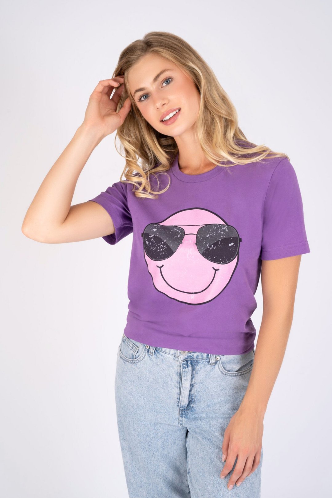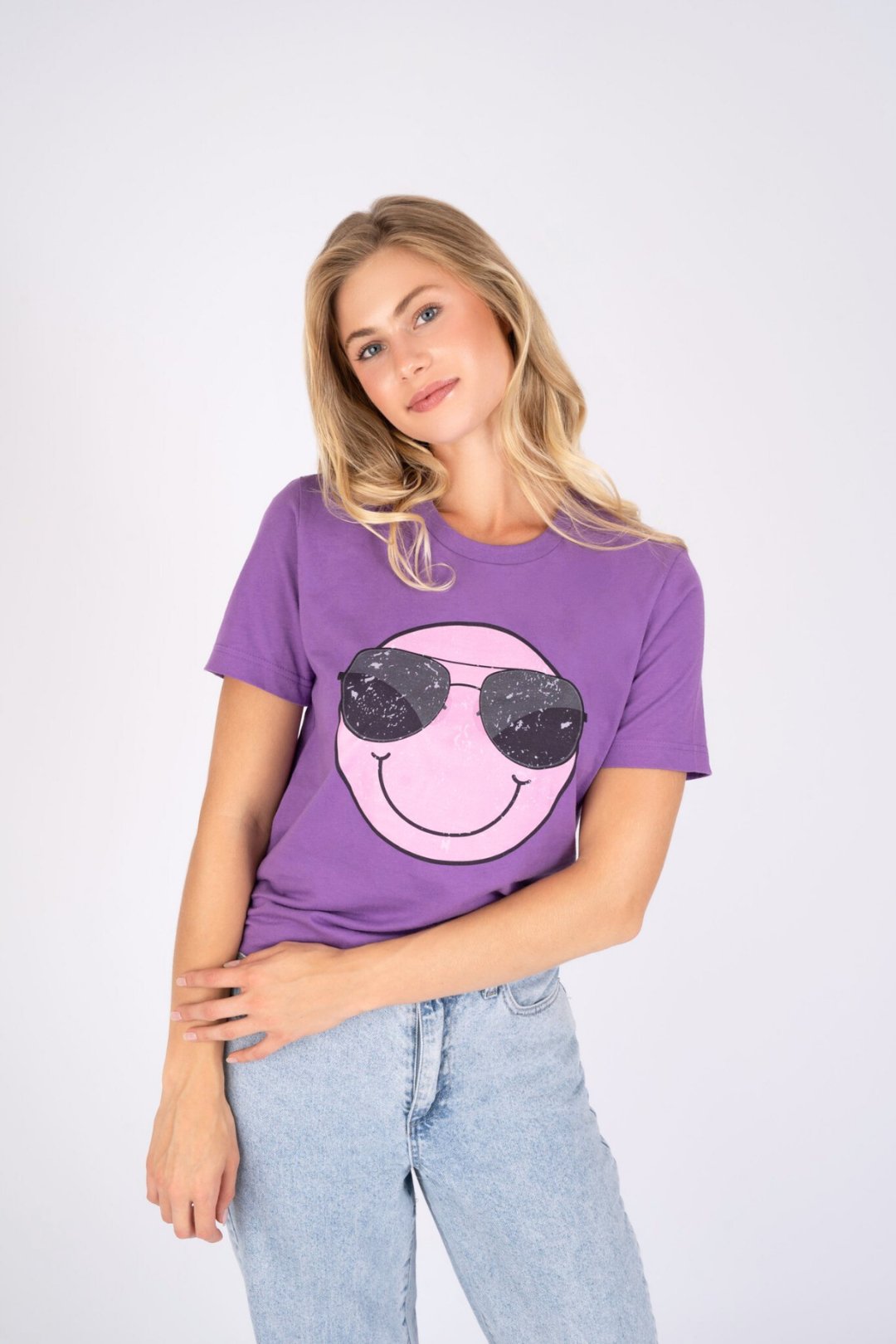 Elevate your casual wear with our striking purple t-shirt, boasting an effortlessly cool smiley wearing sunglasses print on the front that captures a fun, carefree spirit. This tee is expertly crafted from Exceptional Heirloom Cotton, offering a softness that you'll want to feel on your skin again and again, while its breathable comfort ensures you stay fresh all day. Designed for the modern lifestyle, it is remarkably easy to care for, maintaining its vibrant hue and shape wash after wash, so you can enjoy its laid-back charm without the fuss.