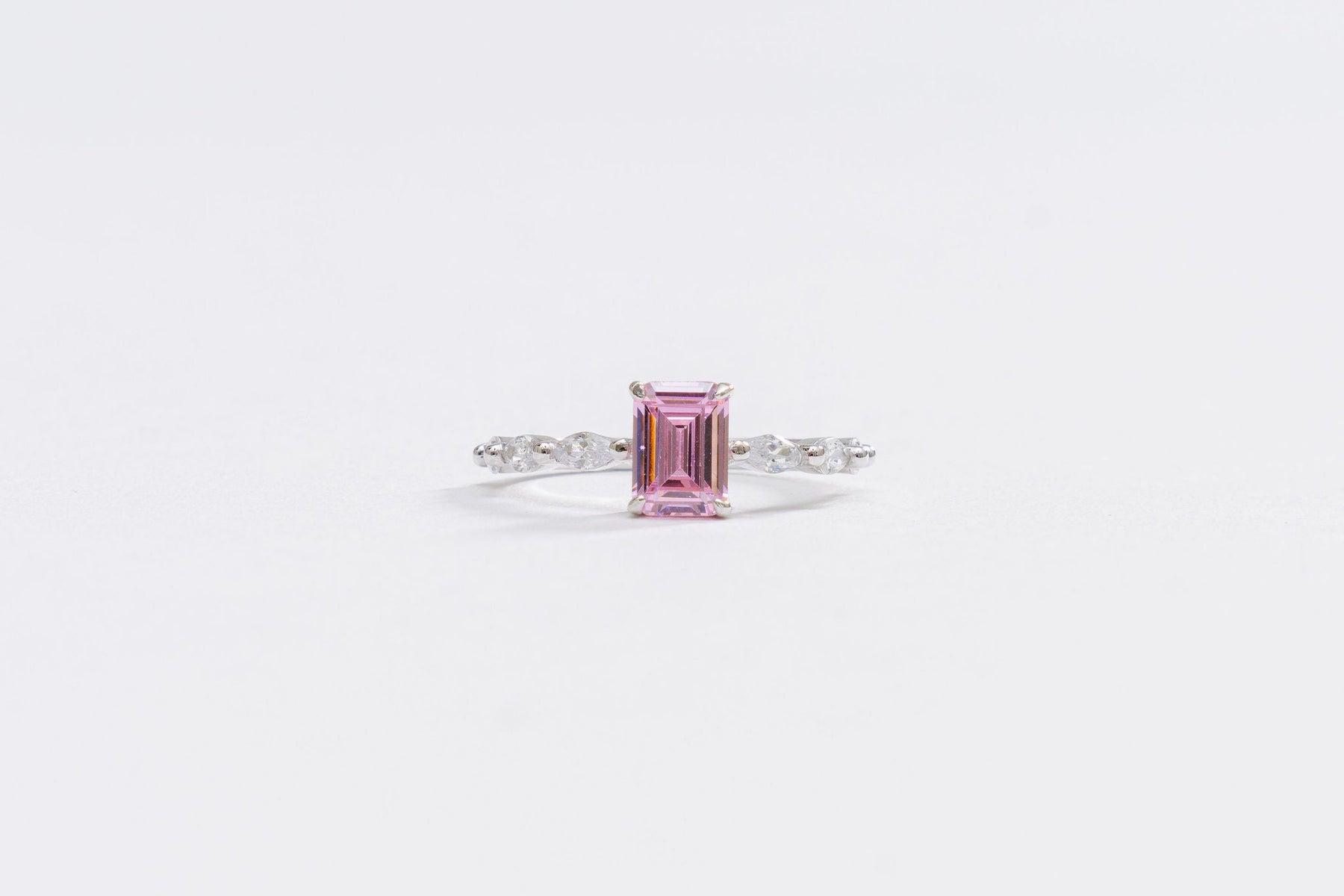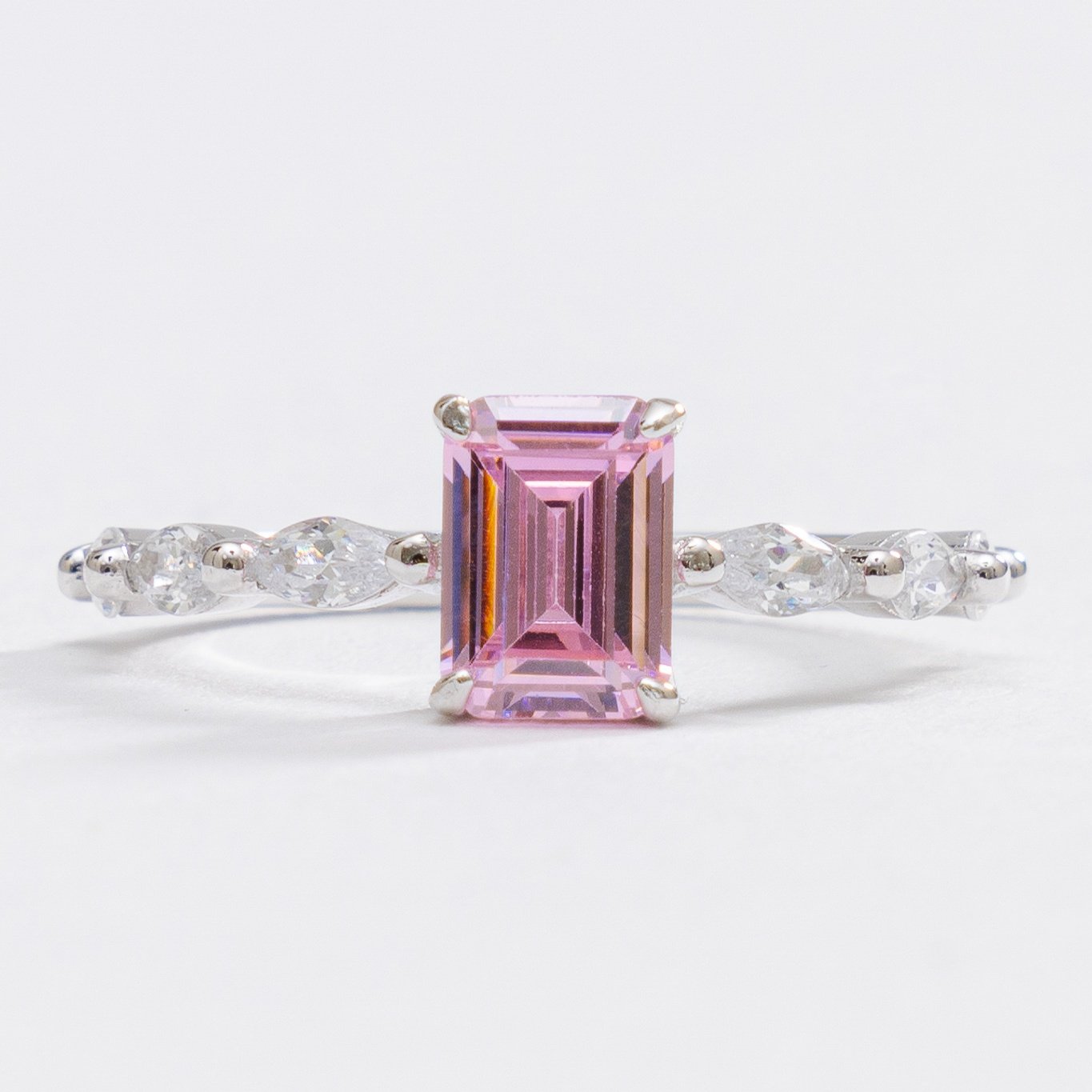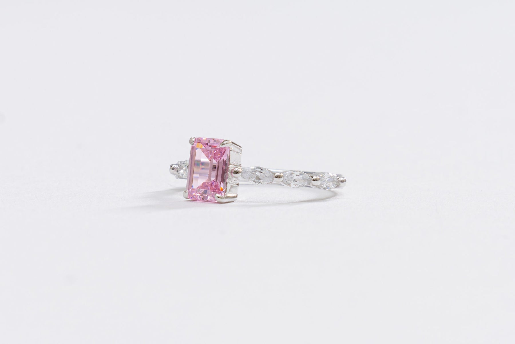 Eligible for 90 Day Quality Guarantee. Introducing the Carrie Ring, an exquisite dainty piece that exudes timeless elegance. This captivating ring features a delicate band adorned with undulating waves, showcasing meticulous craftsmanship. Crafted from high-quality 925 sterling silver and rhodium-plated for a lustrous finish, it is crowned with a petite-sized stunning pink cubic zirconia, adding a touch of radiance to your everyday style. Whether worn casually or for special occasions, the Agatha Ring is a true symbol of sophistication, making it a perfect accessory for those who appreciate the beauty of understated luxury.